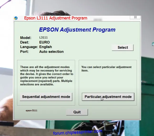 Bước 2: Mở phần mềm ”Ink Pad Reset Epson L3111 Adjustment Program” lên, tại mục ” model Name” chọn ” L3111″